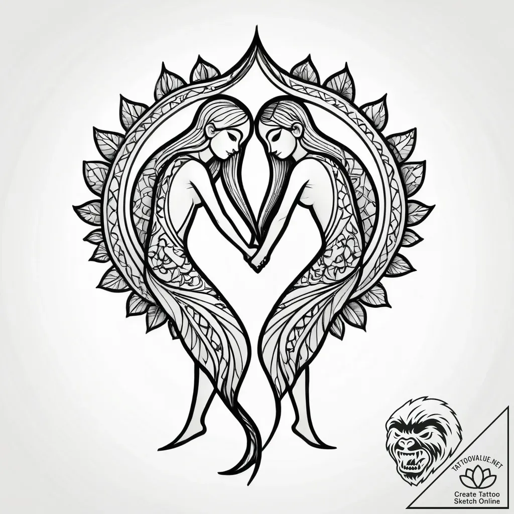 This neo-traditional design blossoms with Art Nouveau elegance, depicting two stylized figures intertwined like the petals of a cosmic flower. Their connected hands form the heart of a vibrant mandala