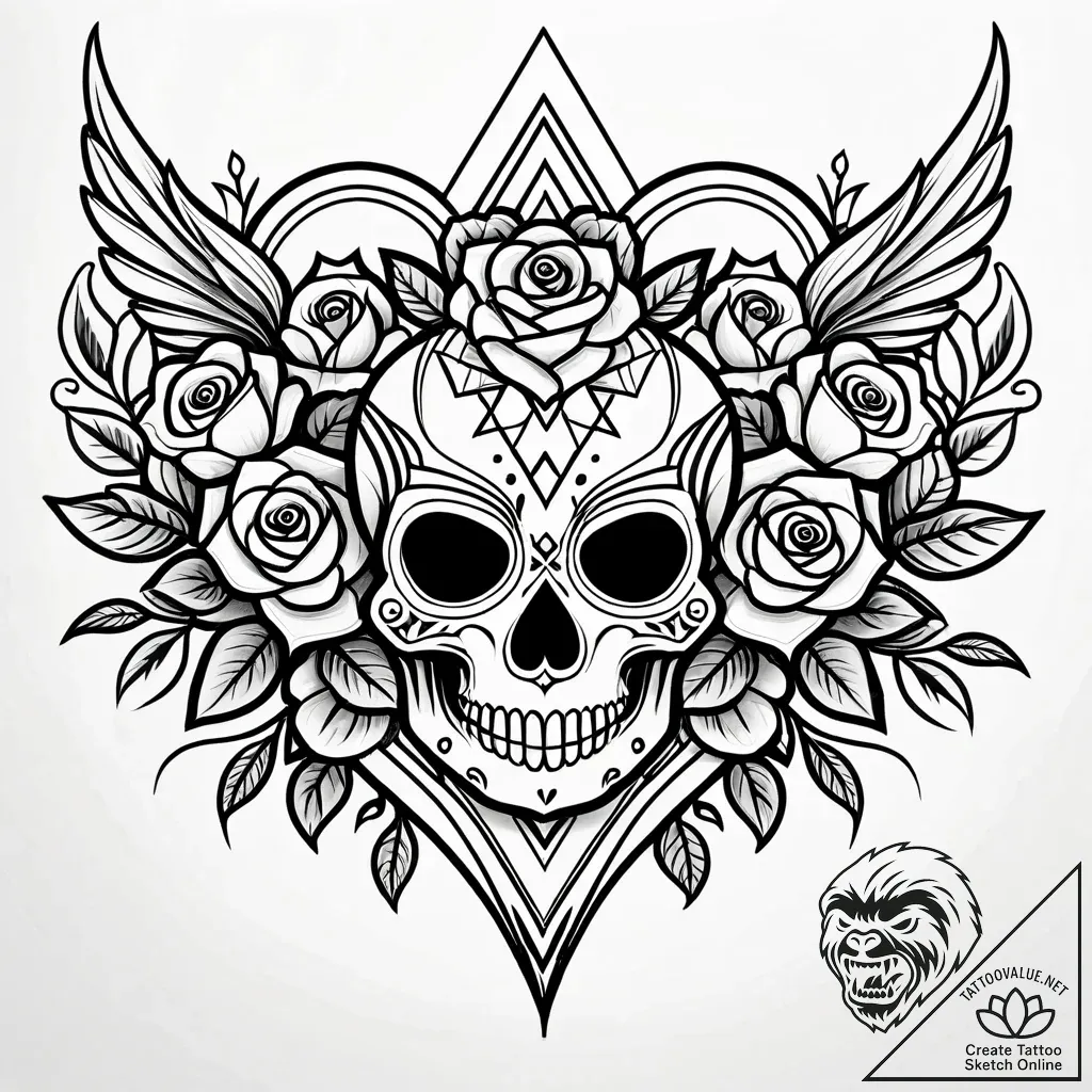 This striking fine-line black and grey sketch is a symphony of delicate linework, where a stylized sugar skull, adorned with geometric patterns, blooms with opulent roses and elegant wings, all framed by a sharp, triangular motif. It's a graphic masterpiece, a dance of light and shadow captured in pure linework, evoking a sense of eternal beauty and poignant transition.