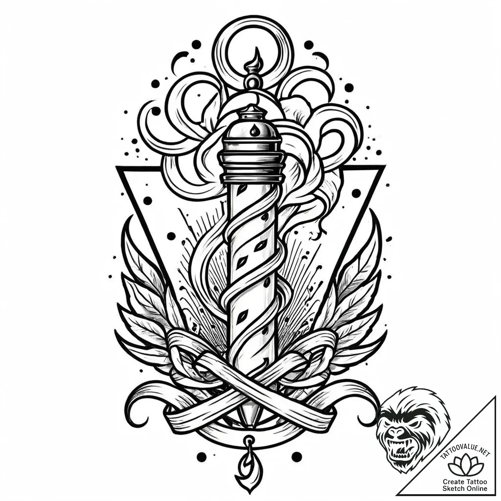 This American traditional sketch is a symphony of bold linework and classic sailor motifs, featuring a barber pole entwined with ribbons and wings, all framed by a subtle triangle and a halo of smoke.