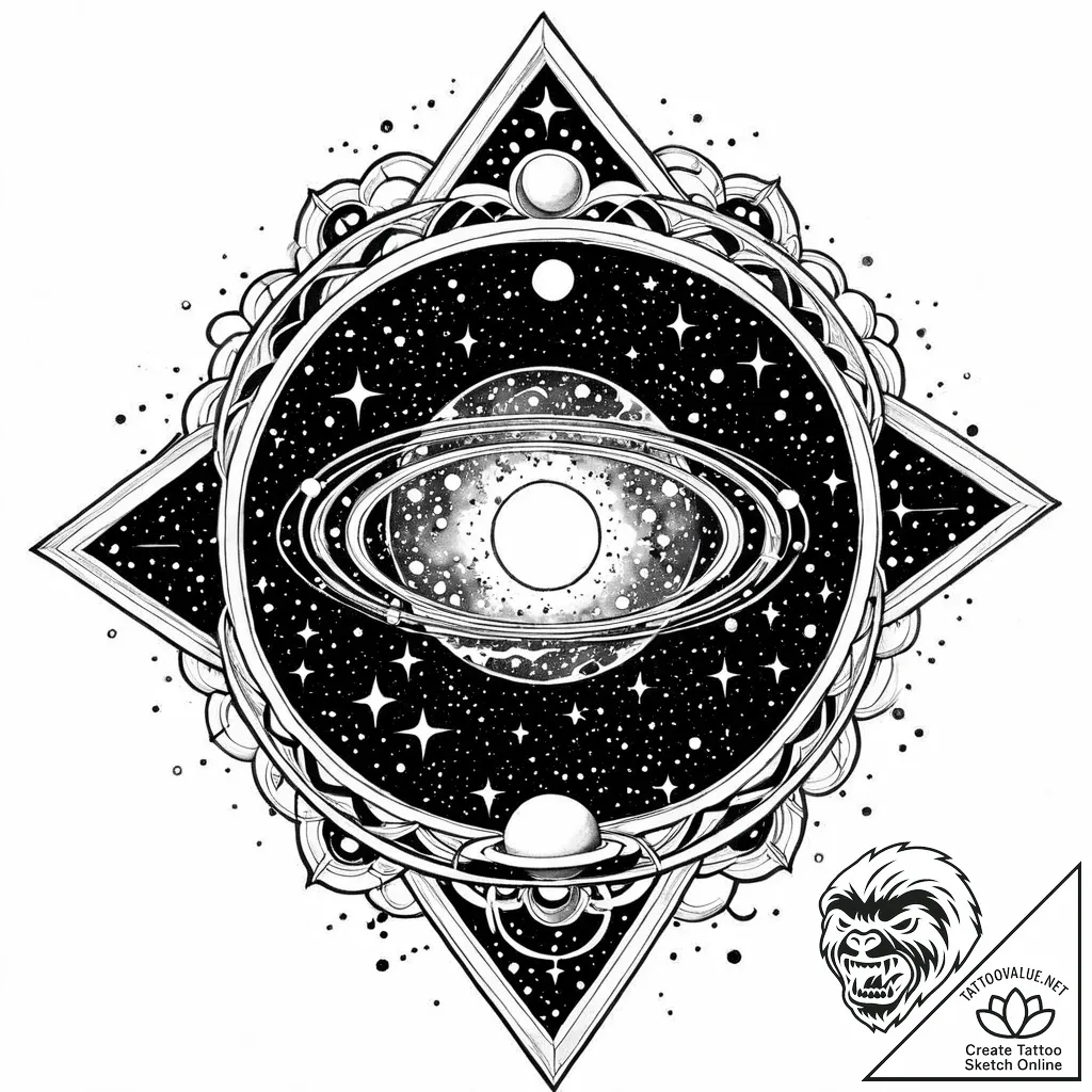 This neo-traditional design is a cosmic mandala, a celestial eye gazing into the infinite expanse of the universe. The intricate dotwork and stippling create a nebula of stars and planets, with a central sun radiating light, all framed by geometric and Art Nouveau-inspired elements. The composition evokes a sense of wonder and mystery, like a cosmic secret whispered in ink.