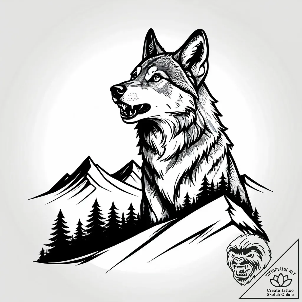 This sketch captures a wolf, a symbol of untamed spirit, perched atop a mountain peak, its howl echoing a triumphant cry after overcoming adversity. Rendered in a raw, linework style with intricate cross-hatching, the design evokes a sense of primal power and rugged beauty, with the wilderness itself seeming to surge from the wolf's form.