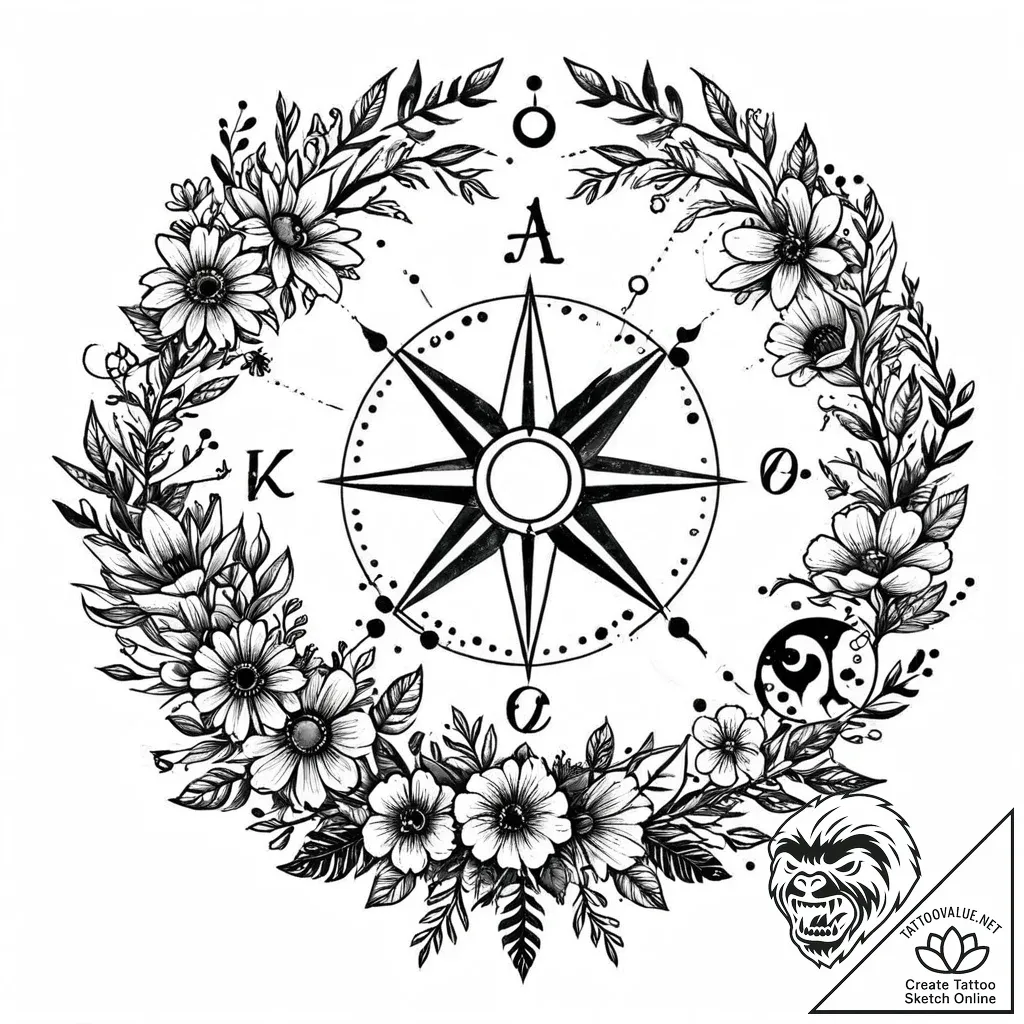 This sketch blooms like a vintage map, where a majestic compass rose, etched with bold, graphic linework, serves as the heart of a swirling wreath of botanical elements. The delicate dance of flowers