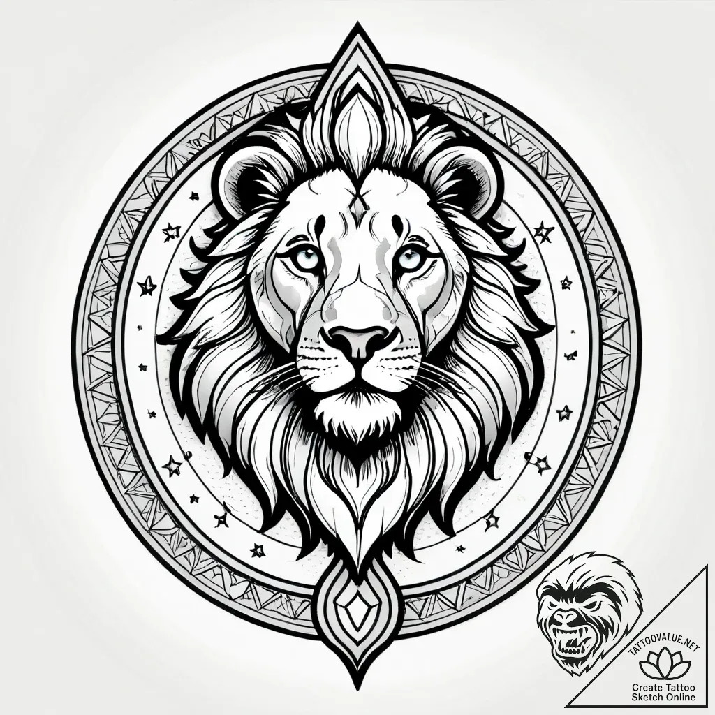 This tattoo sketch presents a majestic lion's head, rendered with a captivating blend of vintage graphic style and modern techniques. The lion's gaze is piercing, framed by a mane that flows like liquid shadow, meticulously built with soft whip shading, pepper shading, and smooth dotwork. Encased within a geometric mandala, the design feels both ancient and contemporary, a powerful symbol radiating strength and regal composure.