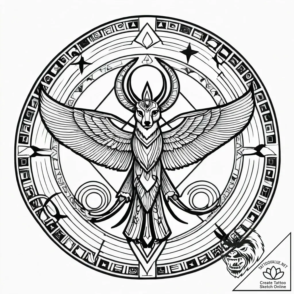 This striking sketch is a celestial tapestry woven from ancient mythologies, featuring a winged creature at its heart, radiating an aura of divine power. The intricate linework, reminiscent of both Egyptian hieroglyphs and Greek geometric patterns, creates a collage-like effect that blends abstract realism with bold graphic elements. The composition, enclosed within a circular frame adorned with celestial motifs, evokes a sense of cosmic order and mystical energy.