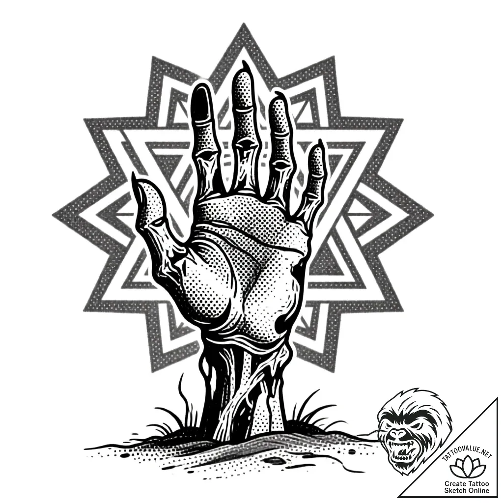 - Original User Request (RU): tattoo design a zombie's decaying hand reaching out from the ground blackwork., ink illustration for tattoo, geometric tattoo style, sacred geometry patterns, mandalas, abstract shapes, symmetrical, on a clean white paper, isolated, dotwork shading, stippling texture, pointillism effect for tattoo, black and white sketch, monochrome, greyscale tones