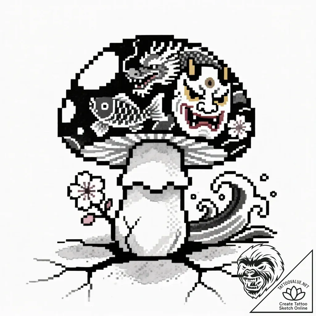 • Original User Request (RU): tattoo design an 8-bit mushroom from a classic platformer growing from a real-world crack watercolor pixel art vibrant., tattoo drawing outline, soft whip shading, pepper shading, smooth dot shading, irezumi japanese tattoo style, traditional japanese motifs (dragon, koi, Hannya, sakura, waves), on a clean white paper, isolated, black and white sketch, monochrome, greyscale tones