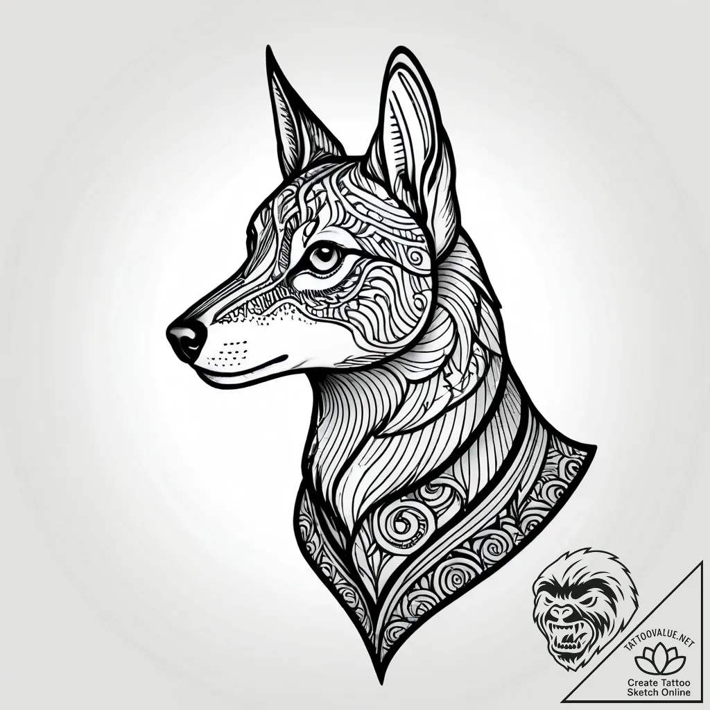 This striking tattoo sketch presents a canine form, not as flesh and blood, but as a network of interconnected pathways – a living circuit board. The design is a masterful blend of graphic linework and delicate dotwork shading, creating a mesmerizing interplay of light and shadow that breathes life into the monochrome form. It’s a study in controlled chaos, where organic shapes are deconstructed and rebuilt with the precision of technology.