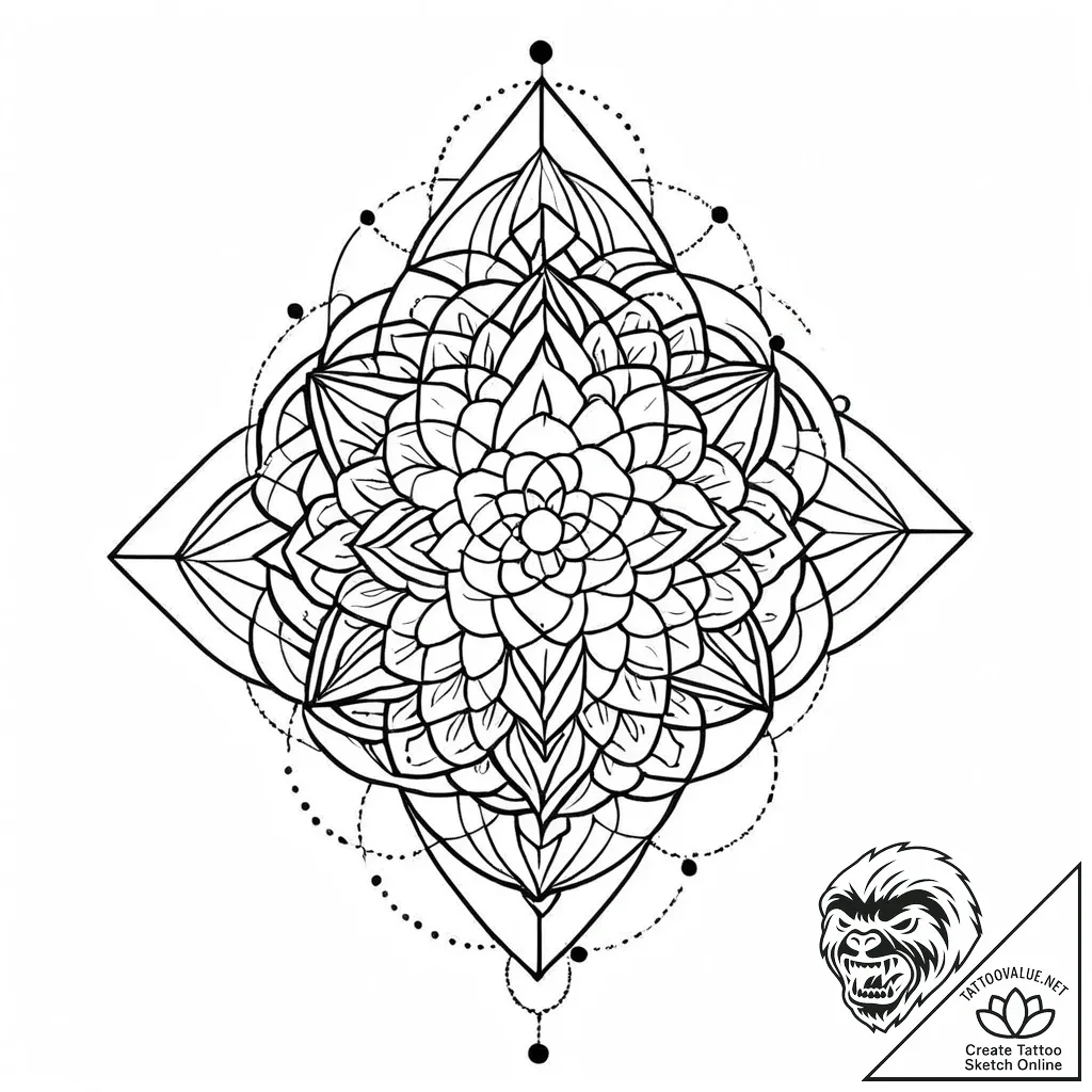 This sketch blossoms like a geometric lotus, its petals crafted from precise lines and punctuated by delicate dotwork, evoking a sense of cosmic order and interconnectedness. The bold, clean linework