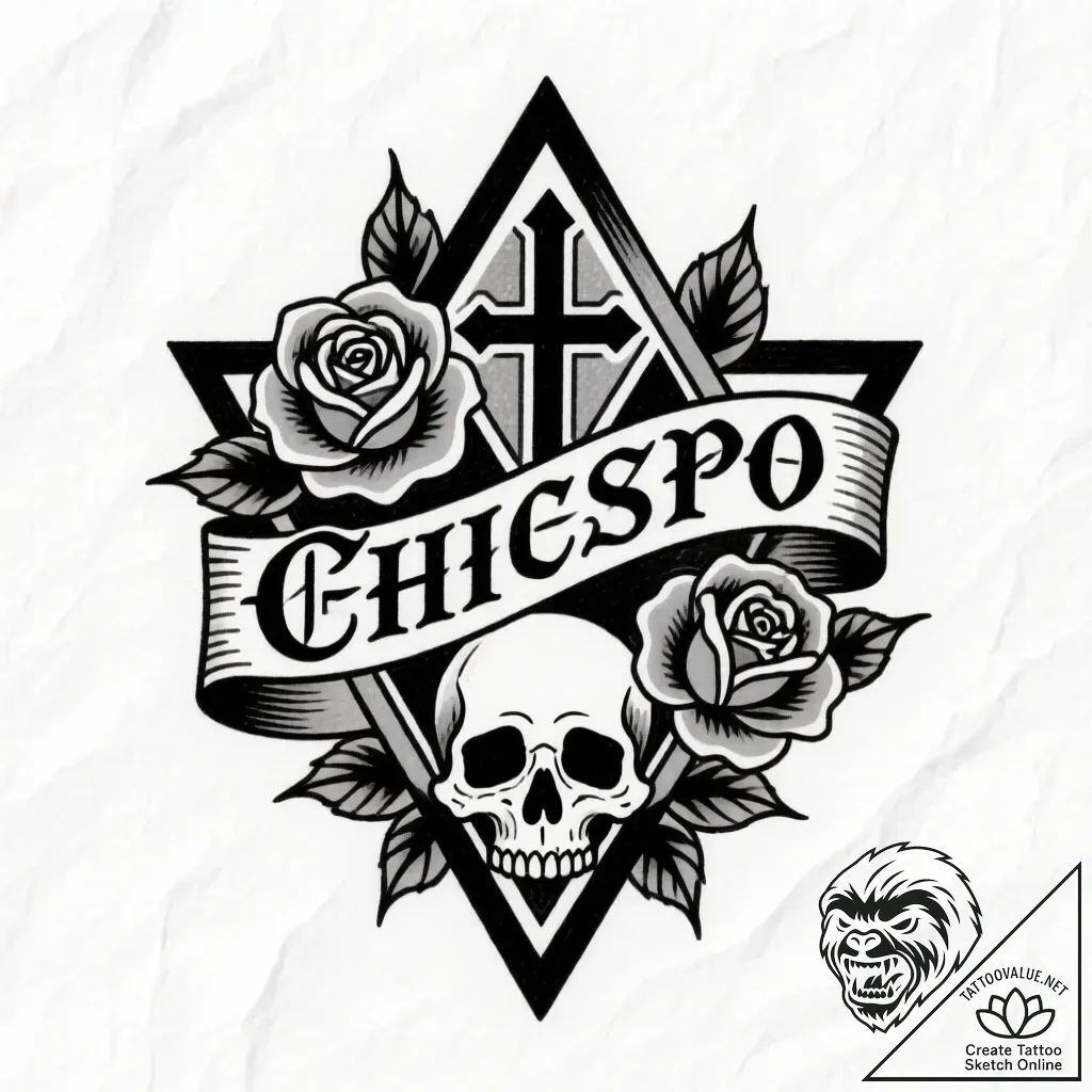 This design is a rich tapestry of symbolism, speaking to themes of mortality, faith, and enduring beauty. The skull represents the inevitability of death, while the roses symbolize love and remembrance. The cross, deeply rooted in religious iconography, suggests faith or spiritual guidance. The 'CHIC SPO' lettering implies a connection to a specific community or belief system, and the overall composition can represent a balanced approach to life, acknowledging its transient nature while cherishing its beauty and finding strength in one's beliefs.