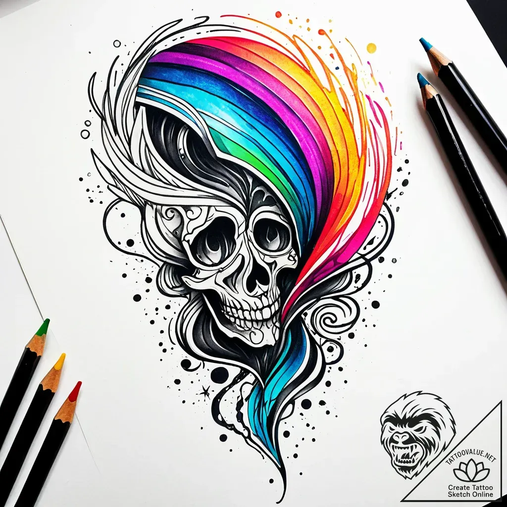 This dynamic design is perfect for individuals who are bold, creative, and unafraid to showcase their inner vibrancy; it would look impressive on the back between the shoulder blades, allowing the colors to flow and the skull's details to be fully appreciated. Alternatively, it would make a striking statement piece on the thigh, offering ample space for the intricate line work and radiant color transitions.
