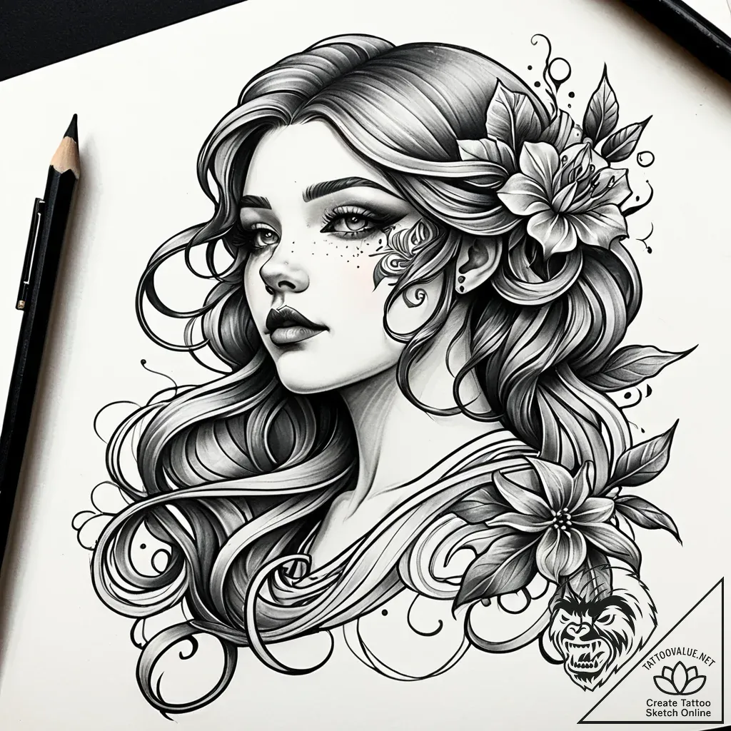 This neo-traditional sketch evokes a wistful beauty, like a faded photograph unearthed from a cherished past. Delicate lines dance with rich black and grey shading, creating a portrait that feels both ethereal and grounded, reminiscent of Art Nouveau's flowing forms. The composition, a harmonious blend of floral elements and a captivating female face, whispers of fleeting moments and enduring grace.