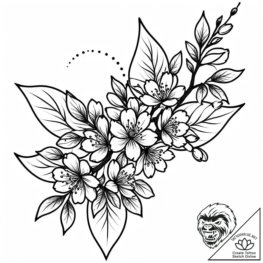 This sketch blossoms with a dramatic, graphic intensity, its bold, thick linework creating a striking contrast against the stark white canvas. The cherry blossom branch, rendered with a delicate touch of dotwork, speaks of moments both cherished and fleeting, its dark ink petals and leaves echoing the ephemeral nature of beauty.