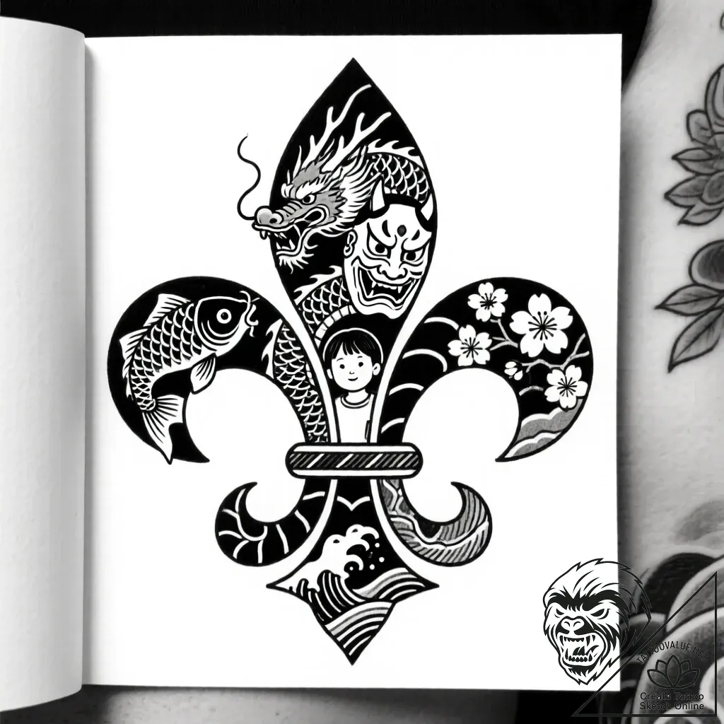 The fleur-de-lis, historically a symbol of royalty and purity, is here reinterpreted as a vessel for personal heritage and strength. The dragon signifies wisdom and power, the koi represents perseverance and good fortune, Hannya masks embody protection against evil, sakura blossoms symbolize ephemeral beauty and rebirth, and the waves speak of life's constant flow and challenges. Together, these elements can represent a protector, a guardian of family lineage, or an individual embodying resilience, wisdom, and the beauty found in life's journey.