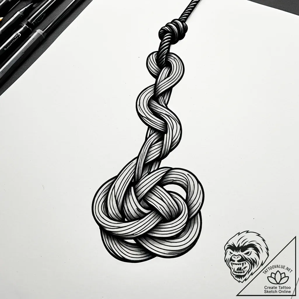 - Original User Request (RU): tattoo sketch a climbing rope forming a strong knot., tattoo line art, clean lines, crisp outlines, sharp linework, on a clean white paper, isolated, blackwork tattoo style, dark art, bold black areas, heavy black ink, muted color palette, desaturated colors, vintage tattoo feel