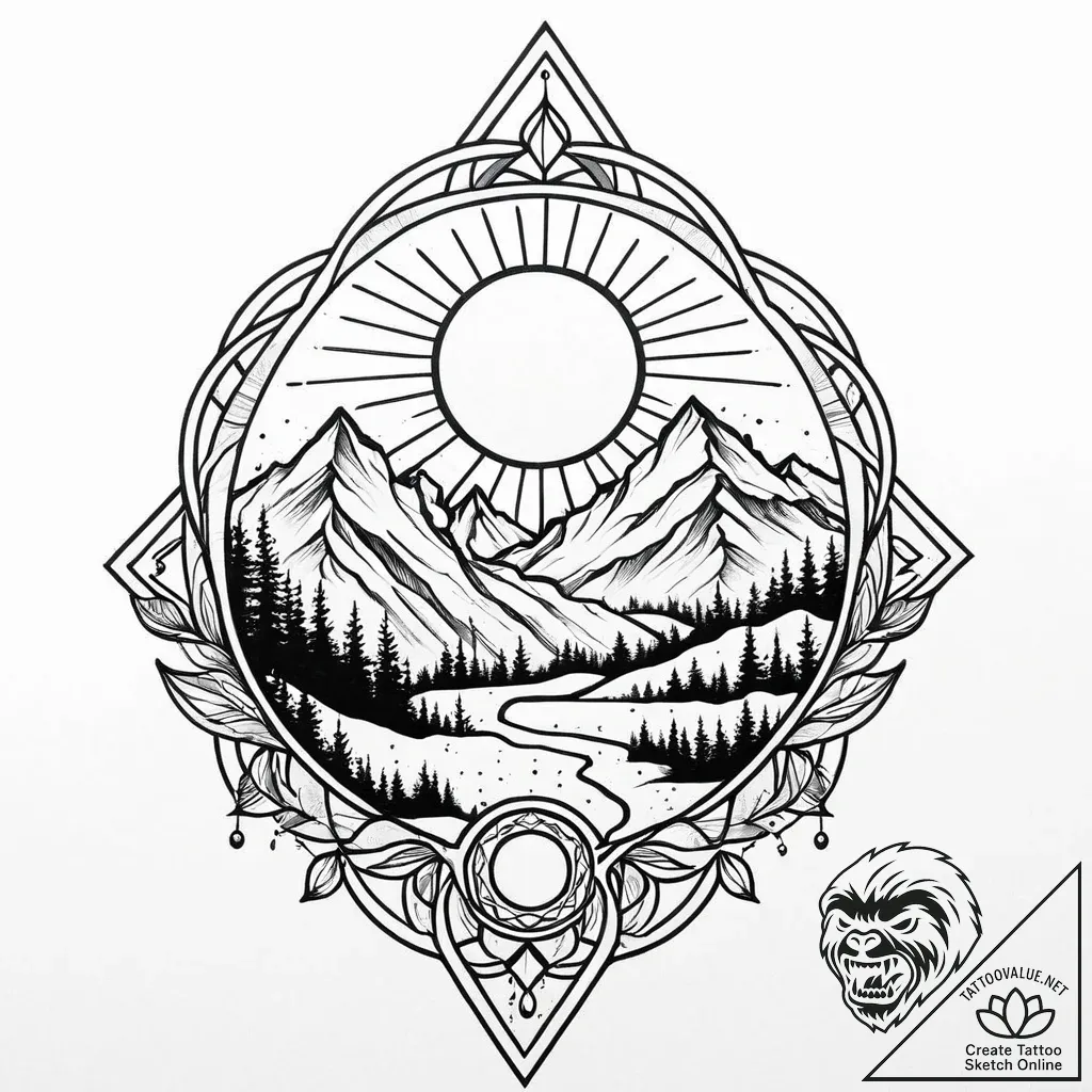 This neo-traditional sketch unfolds like a miniature cosmos, where jagged mountain peaks pierce a sky illuminated by a radiant, sun-like orb. The linework is crisp and deliberate, reminiscent of intricate Art Nouveau illustrations, creating a landscape that feels both grounded and ethereal. The composition, framed by geometric and organic flourishes, evokes a sense of majestic tranquility and the dawn of new beginnings.