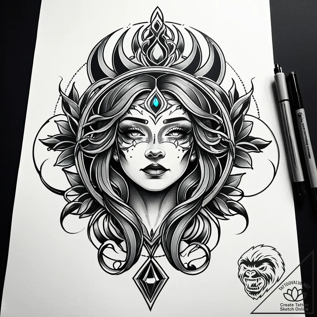 This design embodies feminine mystique and inner radiance, a guardian of hidden knowledge and ethereal beauty. The prominent gemstone atop her brow signifies clarity, intuition, and a connection to the divine, while the surrounding elements suggest protection and the cyclical nature of life. It speaks to a personality that is both strong and graceful, wise and alluring.