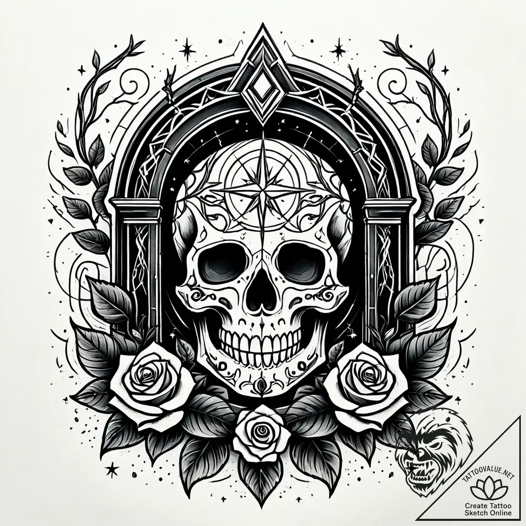 This Chicano-inspired sketch is a hauntingly beautiful portal to the mystical, rendered in fine-line black and grey with a desaturated, vintage tattoo feel. The composition draws the eye through an ornate, gothic archway, framing a skull adorned with a celestial compass, as if charting a course through the darkness of a dense forest, while roses bloom at its base like whispers of life amidst mortality.