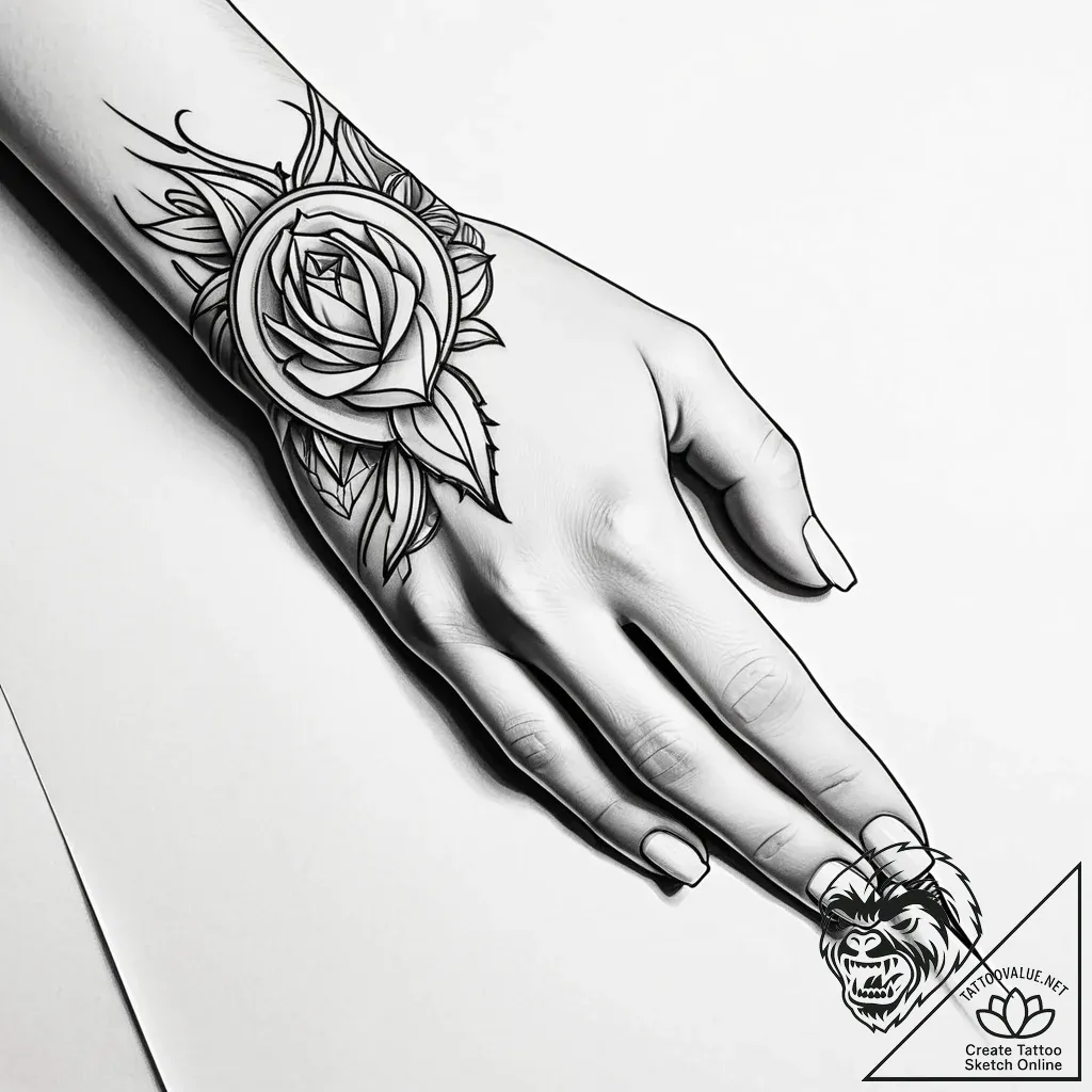 The rose symbolizes beauty, love, and balance, while the encompassing hand represents protection, care, and inner strength guarding something vulnerable. This design speaks to the profound power of nurturing and safeguarding precious aspects of oneself or loved ones, emphasizing qualities of empathy and gentle guardianship.
