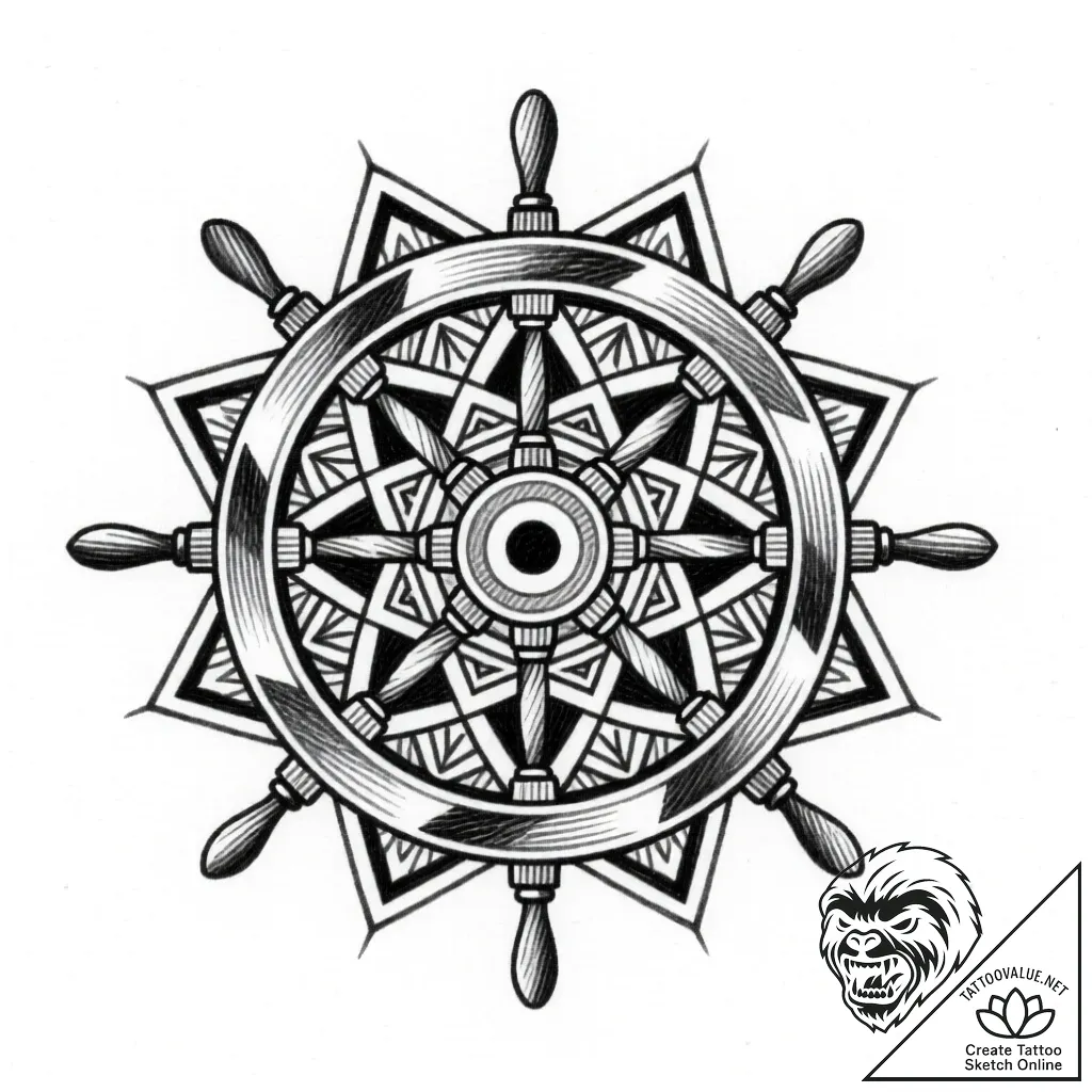 - Original User Request (RU): tattoo sketch a heavy ship's wheel, symbolizing control and navigation., tattoo line art, detailed cross-hatching shading, pen and ink hatching, geometric tattoo style, sacred geometry patterns, mandalas, abstract shapes, symmetrical, black and white sketch, monochrome, greyscale tones, on a clean white paper, isolated