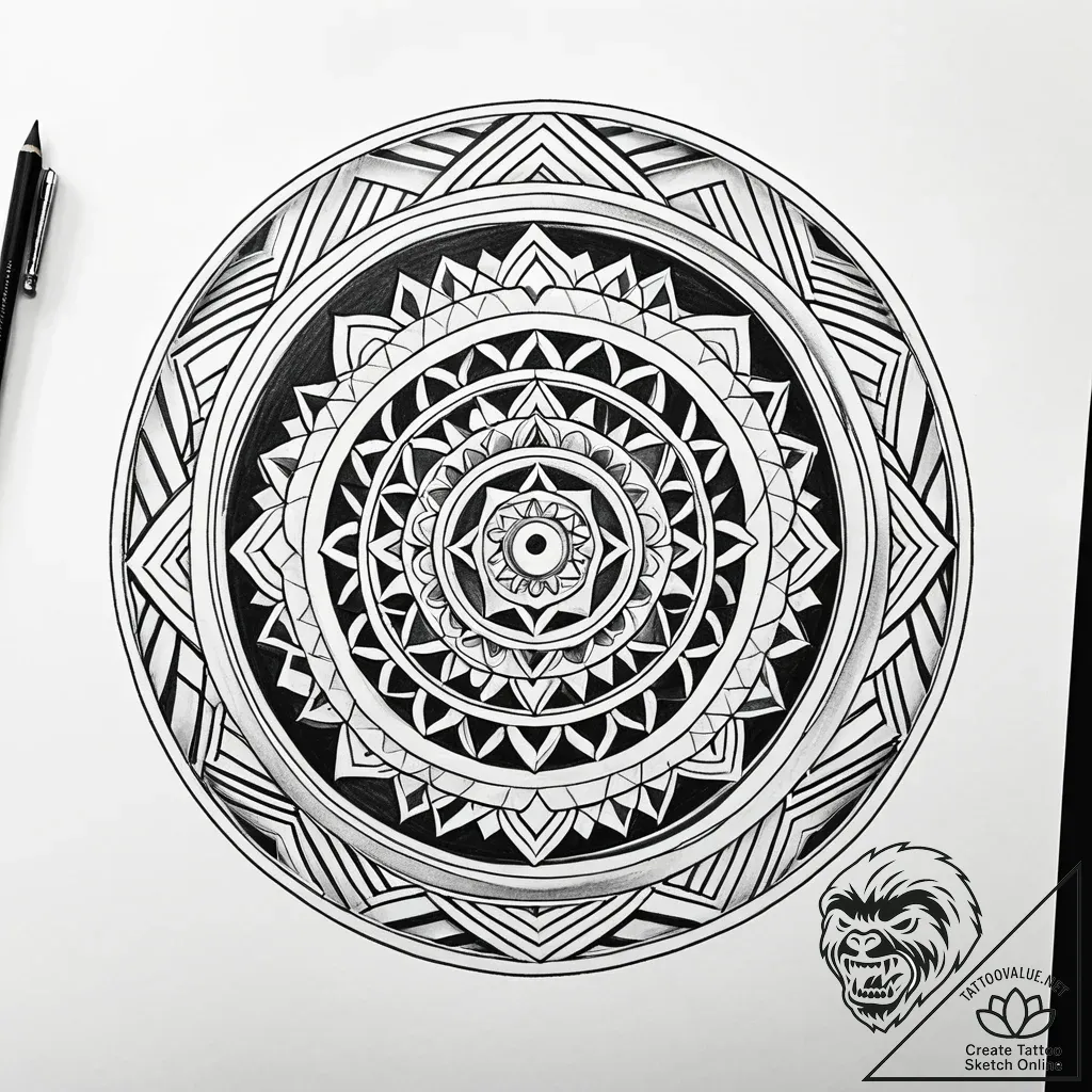 This sketch is ideal for individuals who appreciate intricate detail, symmetry, and the deeper philosophical meanings embedded in art. It would look stunning as a central piece on the upper back, mirroring the body’s natural symmetry, or as a statement piece on the chest, symbolizing a centered and grounded personality. Alternatively, placing it on the thigh allows for a larger canvas to fully appreciate the complexity of the design, showcasing a bold and artistic spirit.