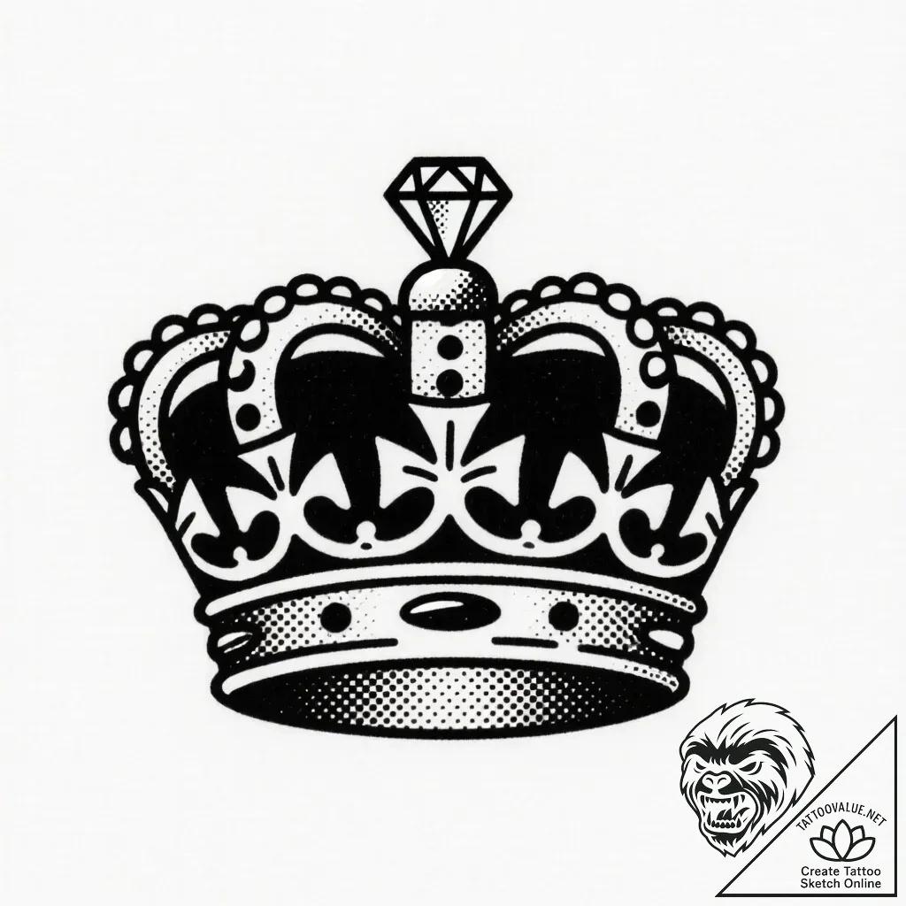 This sketch is a bold, graphic representation of a minimalist crown, rendered with pure linework and accentuated by stippling for a classic dotwork shading effect. The design evokes the timeless appeal of old school traditional American tattoos, reminiscent of sailor motifs, with a single, sharp gem crowning its apex.