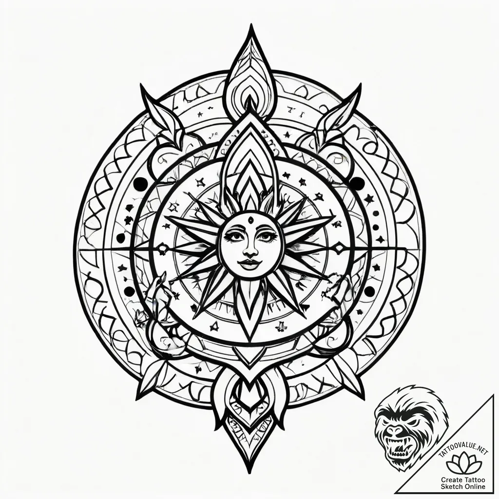 This tattoo sketch is a celestial mandala, a swirling vortex of cosmic energy captured on paper. The central sun, a radiant eye, gazes outward from within layers of zodiac glyphs and abstract forms, c