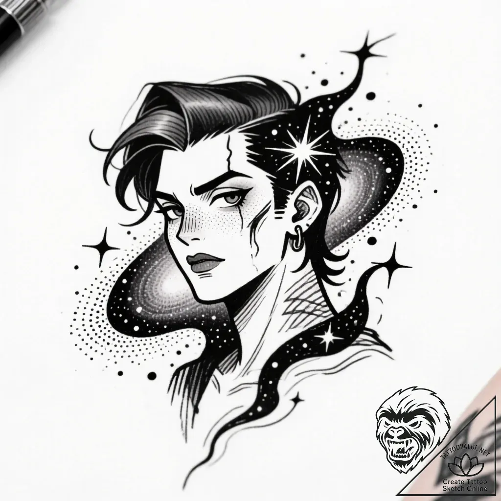 This striking tattoo sketch captures a portrait transitioning into the cosmos, a visual metaphor for transformation and boundless potential. Rendered in a raw, hand-drawn style with bold lines and delicate dotwork, the piece melds the tangible human form with the ethereal expanse of space. Its black and grey palette, enhanced by smooth gradients and fine linework, evokes a sense of mystery and introspective depth.