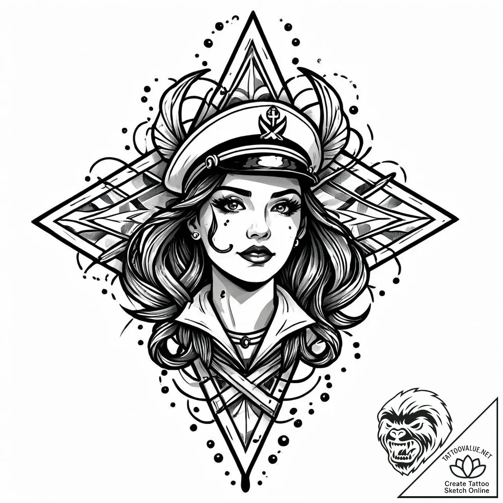 This sketch is a masterful fusion of classic American Traditional tattoo aesthetics with a modern, almost ethereal twist. The central figure, a striking woman in a captain's hat, is rendered with bold, unwavering lines and intricate cross-hatching that evoke the feel of vintage pen and ink work. Her gaze is captivating, drawing the viewer into a world where traditional motifs like anchors and geometric patterns are softened by wisps of hair and a subtle, muted color palette, creating a sense of nostalgic allure.