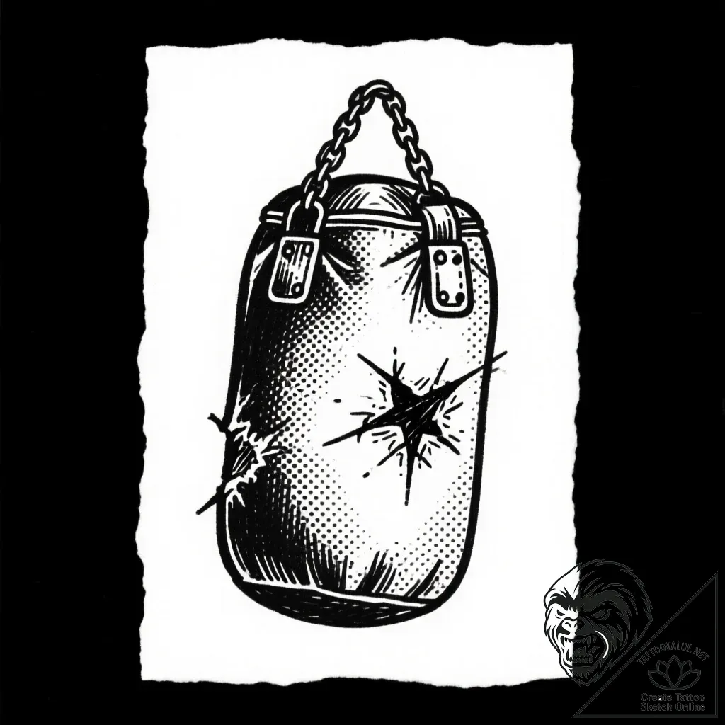 This raw, graphic tattoo sketch captures a heavily dented punchbag, a testament to countless battles fought. Rendered in pure black linework with a rough, unfinished artistic flair, it utilizes cross-hatching and subtle dotwork for a tactile sense of depth and resilience.