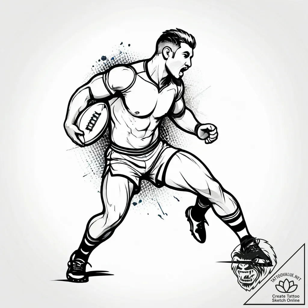 This sketch is ideal for individuals who possess a strong, athletic spirit or a deep passion for rugby. It would look striking on the forearm, showcasing the powerful musculature and dynamic pose, or on the calf, emphasizing the player's grounded power and forward momentum. The abstract watercolor elements can be adapted to a muted or desaturated palette for a vintage feel, or enhanced with vibrant hues to amplify the intensity.
