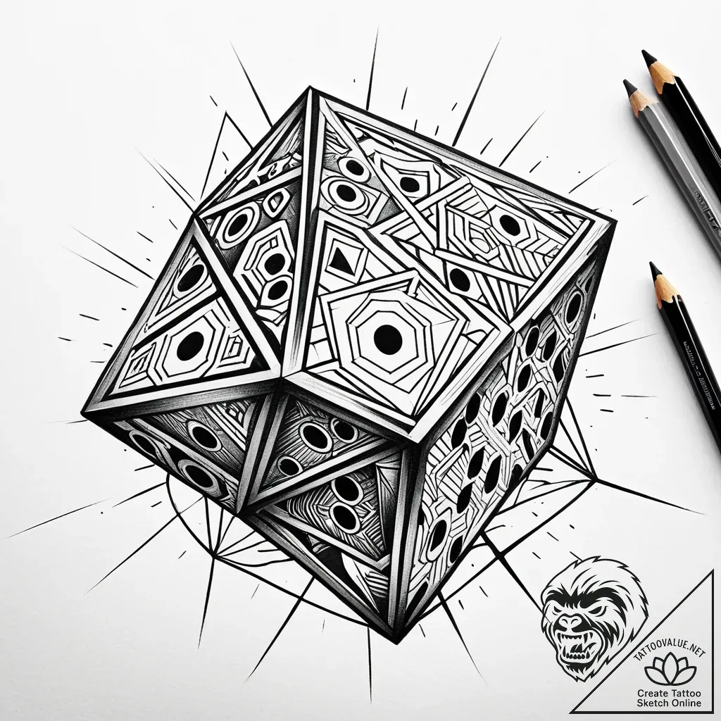 This sketch is a hypnotic geometric marvel, an iambic pentameter of lines and dots forming a d20 dice that seems to vibrate with cosmic potential. Rendered in a stark black and grey dotwork style, its surfaces are a tessellation of intricate patterns, reminiscent of ancient mandalas or celestial maps, hinting at an unseen order within chaos.