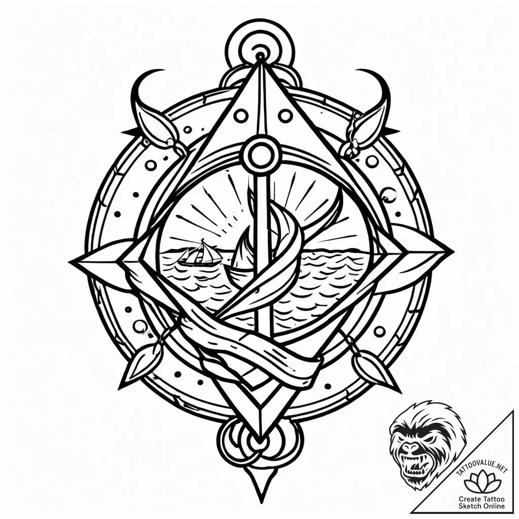 This American Traditional-inspired sketch masterfully blends classic sailor motifs with a symbolic depiction of hope amidst adversity. The bold linework and soft shading create a visually striking composition, centering on a compass rose framing a serene seascape with sailboats, suggesting guidance and peace found even in challenging journeys. The overall mood is one of quiet resilience, imbued with a vintage, almost magical glow.