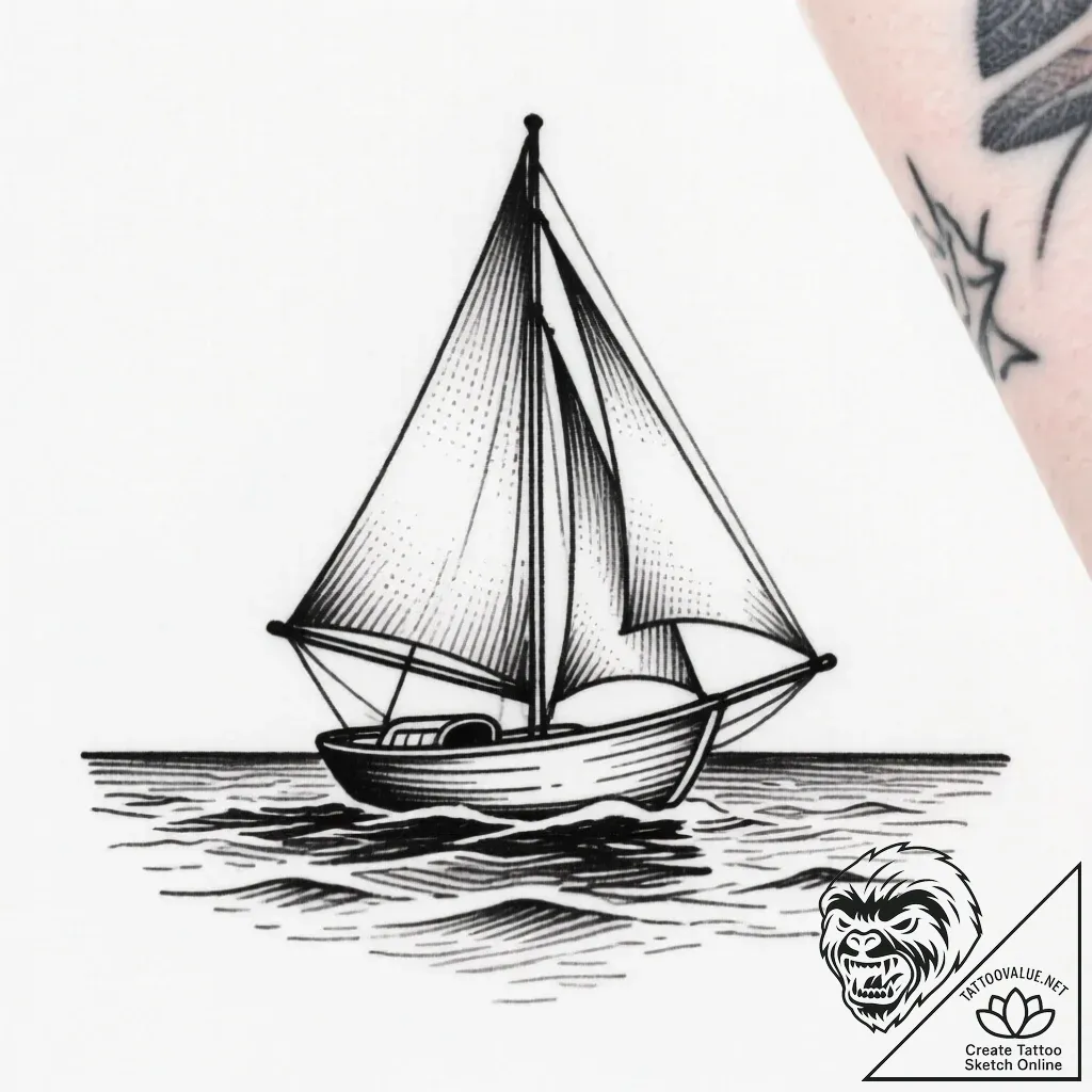 - Original User Request (RU): tattoo sketch a small sailboat on one, the ocean horizon on the other., artistic tattoo sketch, soft whip shading, pepper shading, smooth dot shading, on a clean white paper, isolated, linework tattoo style, clean fine lines, single needle line art, outline tattoo, black and grey tattoo shading, smooth gradients