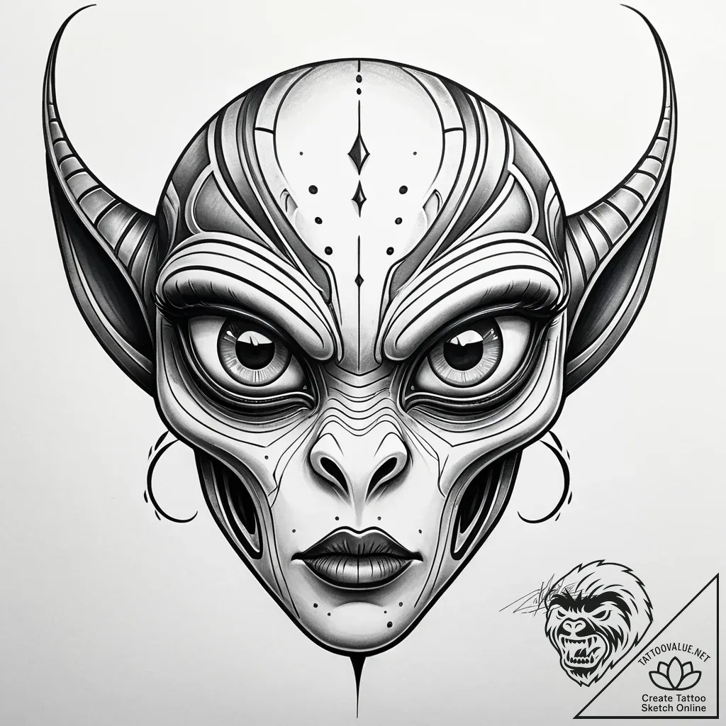 This black and grey tattoo sketch is a portrait of an otherworldly being, its face a canvas of intricate linework and delicate shading. Large, soulful eyes hold an ancient wisdom, framed by stylized horns that curve like crescent moons, giving the impression of a creature caught between realms. The smooth gradients and fine lines create a photorealistic depth, making this stylized alien head feel both alien and intimately familiar.