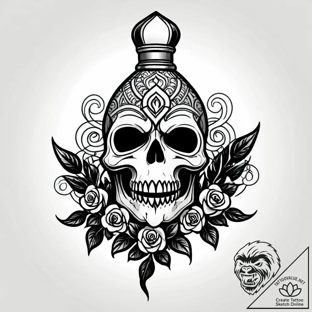 This striking blackwork piece is a masterful fusion of morbid beauty and intricate detail. The stylized skull, crowned with a regal, almost religious headdress, is softened by a cascade of delicate ro