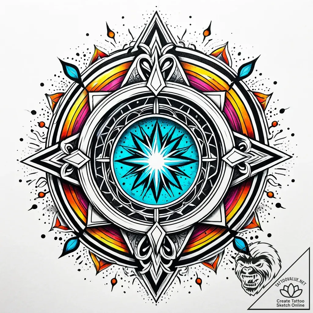 This sketch is a vibrant mandala-like design, a stylized portal crackling with energy. Its graphic composition, infused with dotwork and cross-hatching, creates a sense of depth, drawing the eye towards a luminous, starburst core. The bold, full-spectrum colors radiate outwards, hinting at a gateway to the unknown.
