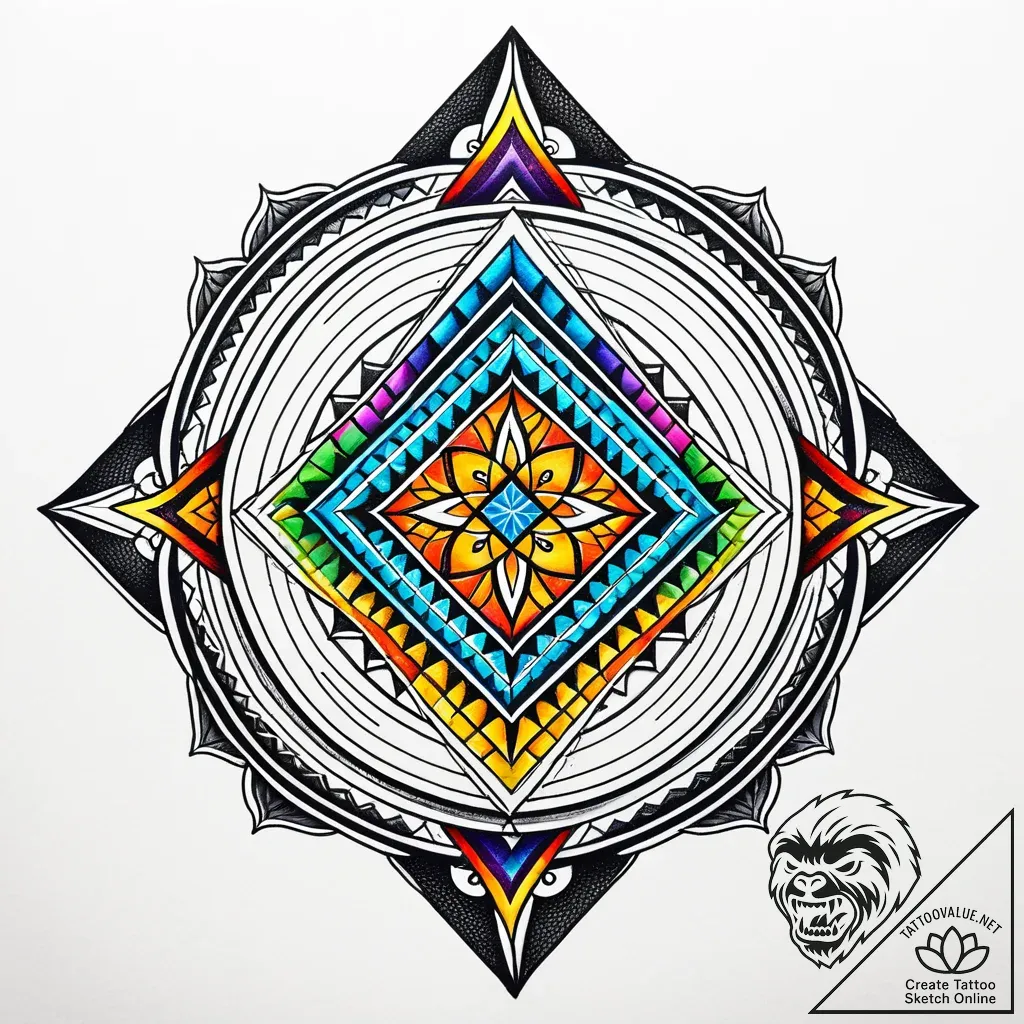 This tattoo sketch is a mesmerizing kaleidoscope of geometric precision and vibrant energy, where a central diamond bursts with a full spectrum of rainbow hues, radiating outward like a captured sunbeam. Delicate dotwork and fine linework weave through the design, creating an intricate tapestry that speaks of cosmic order and inner harmony. The overall effect is a powerful yet graceful mandala, a visual mantra designed to captivate and inspire.