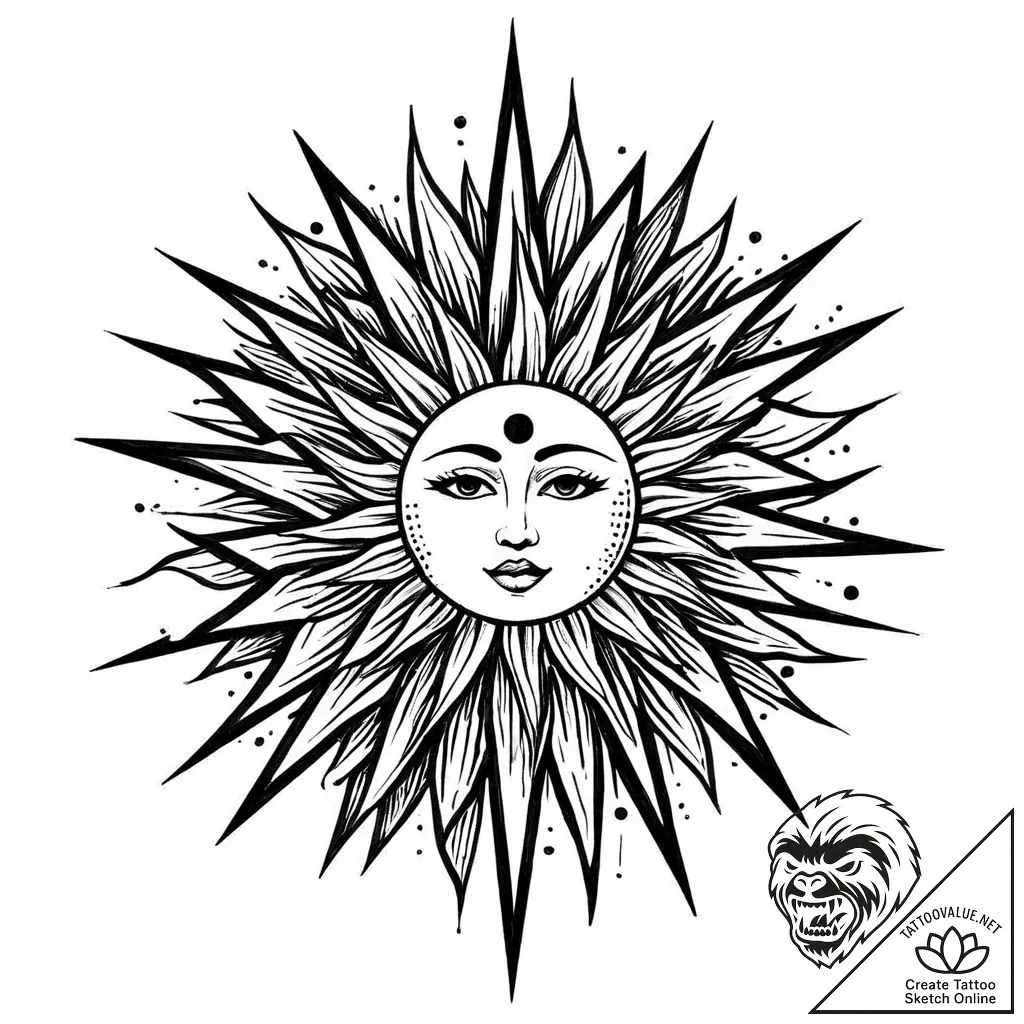 This striking sun design is perfect for individuals with a bold and dynamic spirit. Its graphic nature and powerful imagery would look impressive on the forearm, allowing the rays to wrap around the limb, or as a prominent statement piece on the calf. It could also be a captivating focal point on the upper back, between the shoulder blades, symbolizing inner radiance and strength.