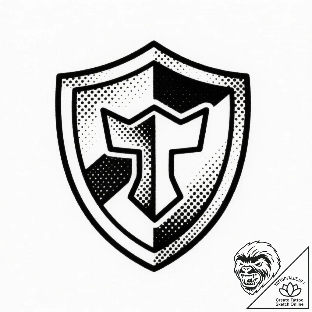 This shield tattoo sketch is a striking emblem of stoic resolve, rendered in pure linework with a bold black outline. Geometric dotwork and stippling techniques create a dynamic texture, like a conste