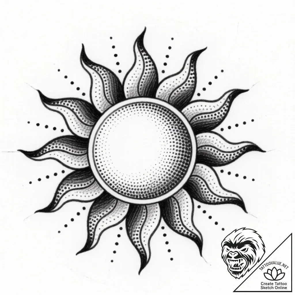- Original User Request (RU): tattoo sketch a sunflower following the path of a sun symbol., concept art for tattoo, dotwork tattoo style, stippling art, pointillism, geometric dotwork, rough sketchy lines, hand-drawn pencil sketch effect, artistic unfinished look, black and grey tattoo shading, smooth gradients, on a clean white paper, isolated