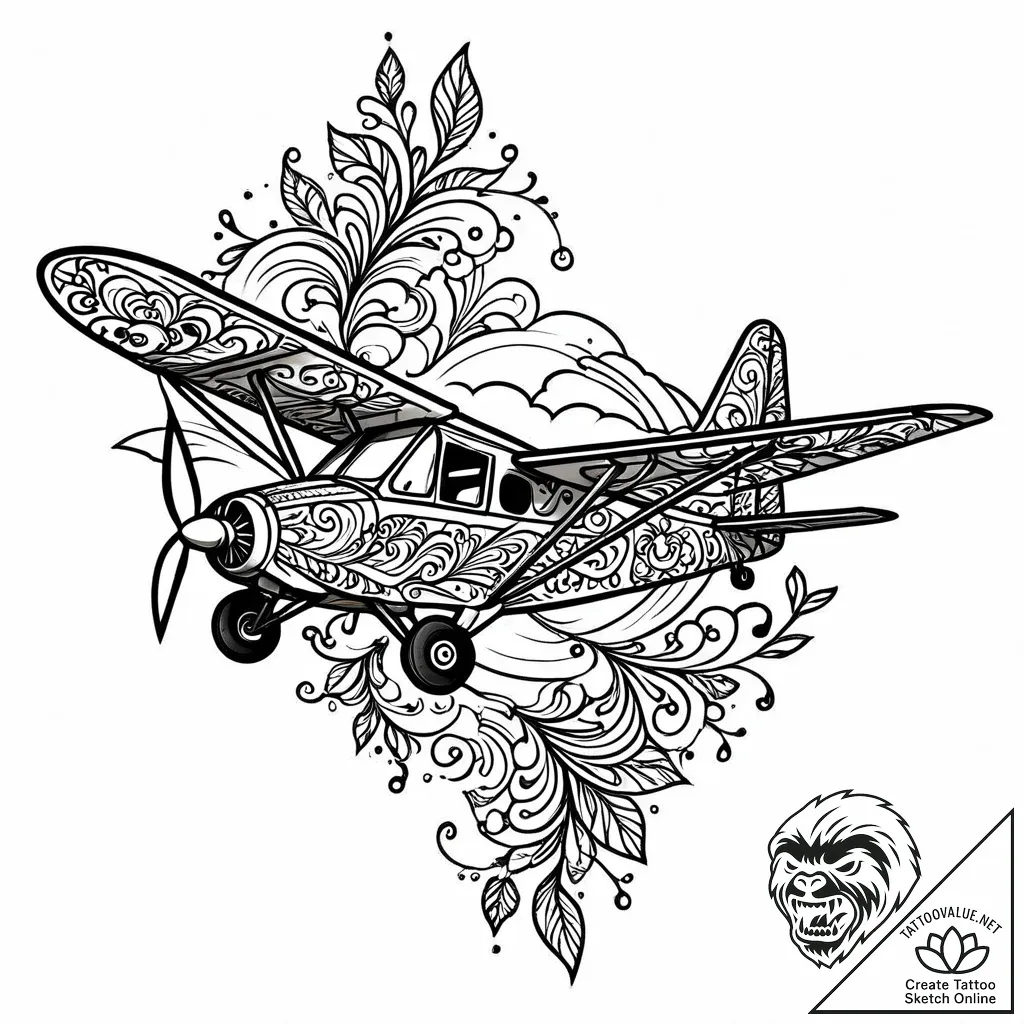 This sketch is a captivating blend of mechanical marvel and organic artistry, where a vintage airplane becomes a canvas for intricate filigree. Flowing, delicate linework, reminiscent of single-needle
