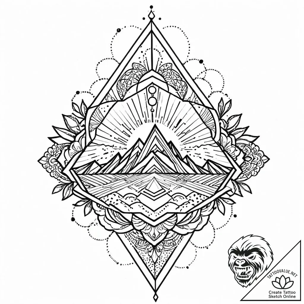This tattoo embodies aspiration, growth, and the cyclical nature of life, much like a sunrise signifies new beginnings and the enduring power of nature. The geometric framework speaks to order and structure, while the natural elements and mirrored reflection symbolize balance, introspection, and the interconnectedness of the universe. It is a potent reminder of inner strength and the journey towards enlightenment.