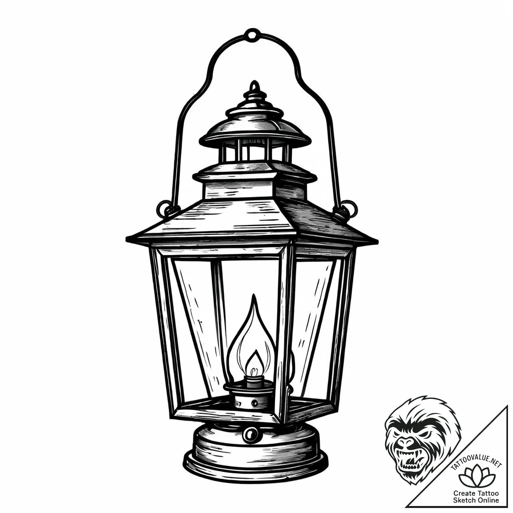 This meticulously crafted linework sketch captures a vintage lantern, its warm, inviting glow rendered through crisp black and white tones and sharp, precise lines. The design, presented on a clean wh