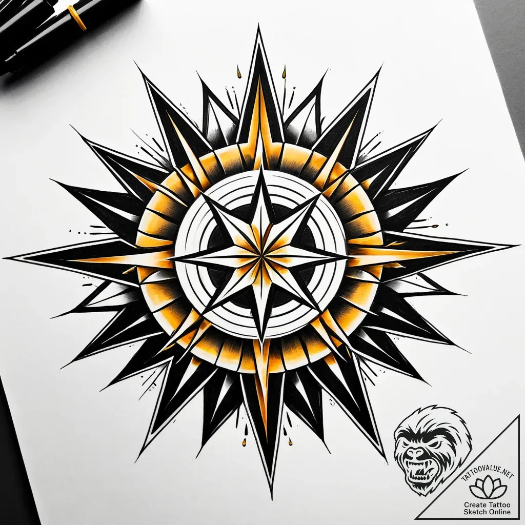 This blackwork tattoo sketch is a radiant compass rose, a celestial navigator etched with sharp, crisp linework. Its bold black areas are softened by smooth, warm golden gradients, creating a striking contrast that hints at both the darkness of the unknown and the guiding light of purpose. The design explodes outward with fierce, sharp points, like a starburst of destiny.