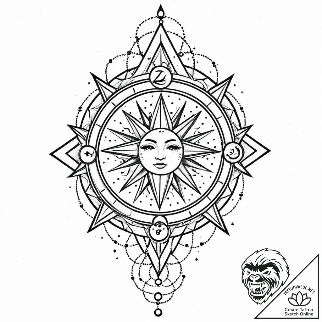 This tattoo is a powerful emblem of guidance, enlightenment, and the cyclical nature of existence, drawing heavily on astrological and cosmic symbolism. The sun represents life, power, and consciousness, while the surrounding geometric elements and celestial bodies signify order, destiny, and the pursuit of inner truth.