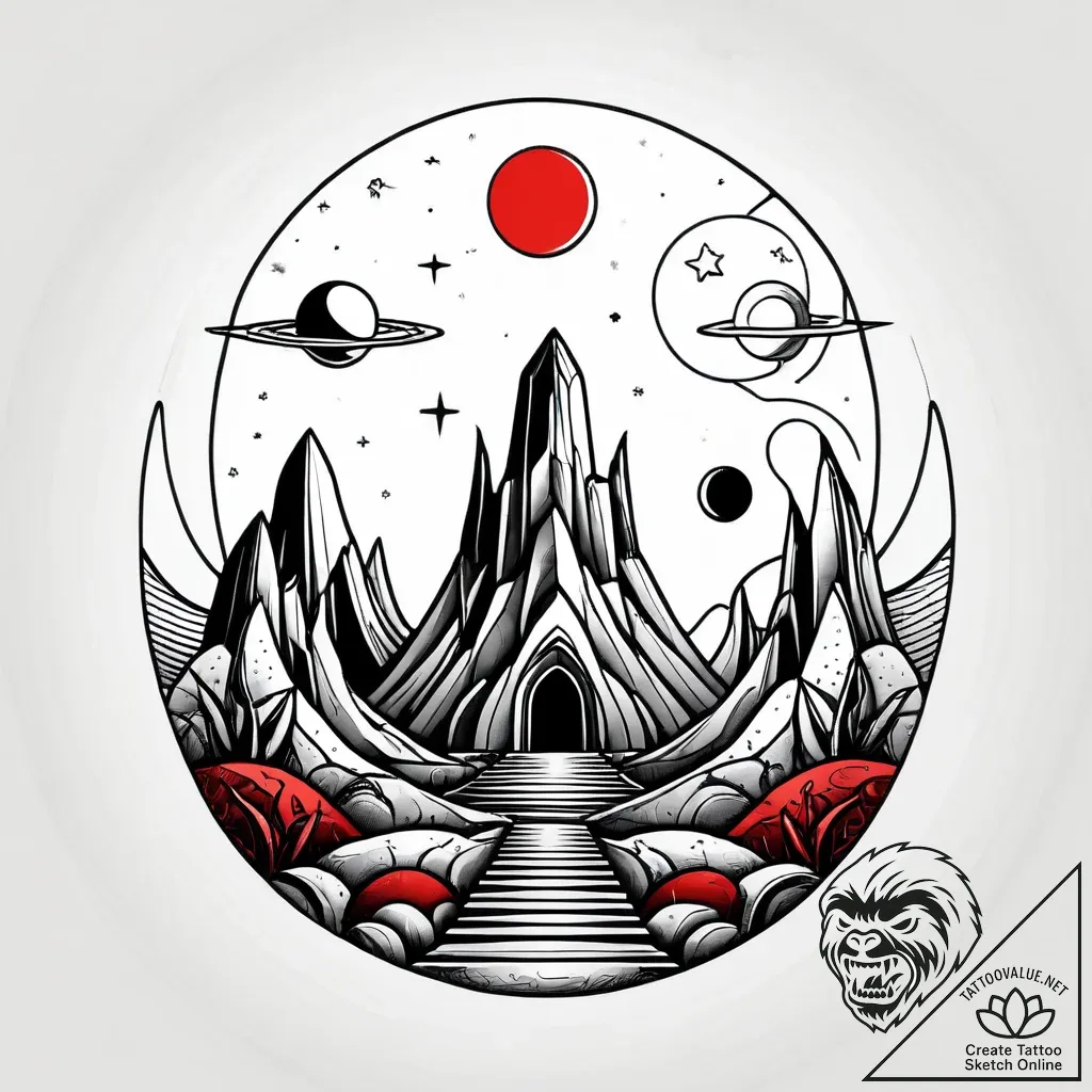 This sketch is ideally suited for individuals who embrace their adventurous and curious nature. It would look impressive on the forearm or calf, allowing the detailed landscape to unfold with each movement, or on the back between the shoulder blades, creating a powerful, expansive statement as if carrying a piece of another world.