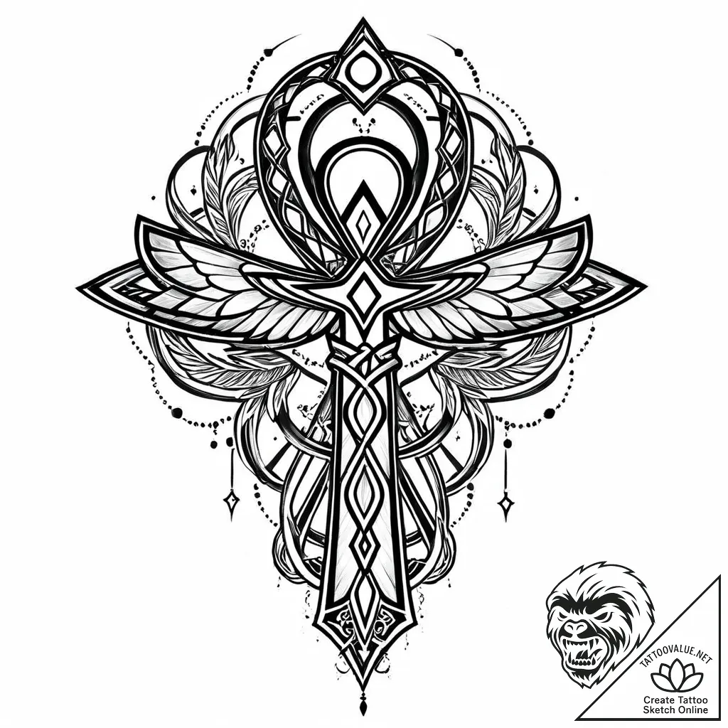 This tattoo sketch is a celestial symphony of linework, where the ancient Ankh symbol is reborn with ethereal wings and intricate, mandala-like patterns. The design evokes a sense of divine radiance, with delicate dotwork and feather motifs suggesting a cosmic dance of light and shadow, a true emblem of eternal grace.