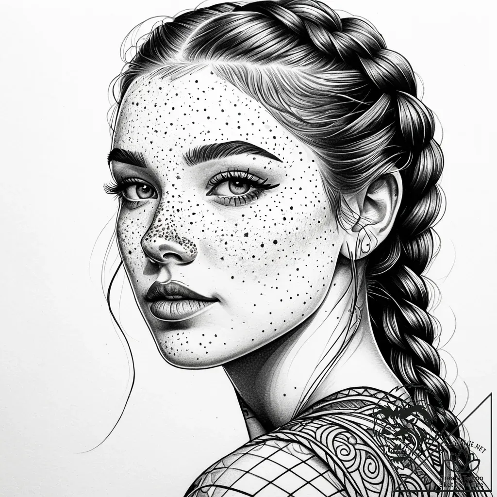This sketch presents a delicate portrait of a woman, her face a canvas dusted with stippled freckles that bloom like constellations against soft linework. Rendered in a graphic style with intricate dotwork, the piece captures a serene yet striking gaze, with a beautifully rendered braid cascading down, embodying a blend of natural charm and artistic precision.