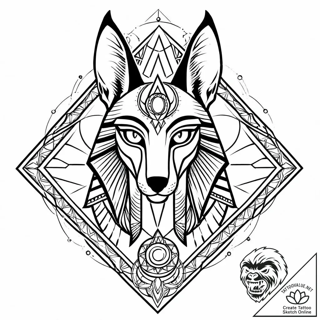 - Original User Request (RU): tattoo sketch, anubis guarding doorway to afterlife with jackal head, glowing eyes piercing dark egyptian underworld, mystic funerary tattoo, tattoo drawing outline, geometric tattoo style, sacred geometry patterns, mandalas, abstract shapes, symmetrical, on a clean white paper, isolated, rough sketchy lines, hand-drawn pencil sketch effect, artistic unfinished look, black and white sketch, monochrome, greyscale tones