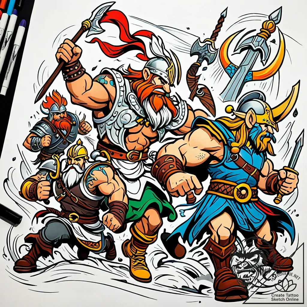 - Original User Request (RU): tattoo sketch, asterix and vikings battle scene with dynamic motion, comic ink tattoo, tattoo flash sheet design, on a clean white paper, isolated, bold outlines, thick lines, heavy linework, vibrant colors, full color spectrum, bold bright tattoo inks, neo traditional tattoo, illustrative, art nouveau influence, detailed, rich colors